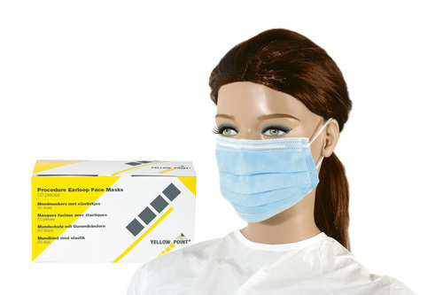 3-lagers munskydd med näsklämma och elastiska öronsnoddar. Lågt andningsmotstånd. Stänkbeständigt inre och yttre skikt, Stänkmotstånd 60 kPa, BFE ≥98%, andningsmotstånd ΔP <60,0 Pa/cm2.