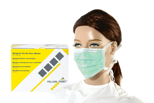 3-lagers operationsmunskydd med näsklämma och knytband. Lågt andningsmotstånd. Stänkbeständigt inre och yttre skikt, Stänkmotstånd 60 kPa, BFE ≥98%, andningsmotstånd ΔP <60,0 Pa/cm2.