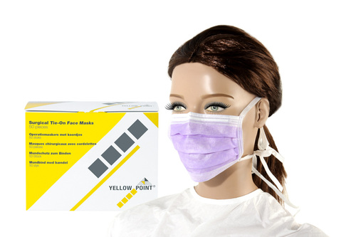 3-lagers operationsmunskydd med näsklämma och knytband. Lågt andningsmotstånd. Stänkbeständigt inre och yttre skikt, Stänkmotstånd 60 kPa, BFE ≥98%, andningsmotstånd ΔP <60,0 Pa/cm2.