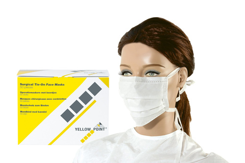 3-lagers operationsmunskydd med näsklämma och knytband. Lågt andningsmotstånd. Stänkbeständigt inre och yttre skikt, Stänkmotstånd 60 kPa, BFE ≥98%, andningsmotstånd ΔP <60,0 Pa/cm2.