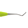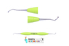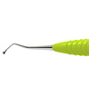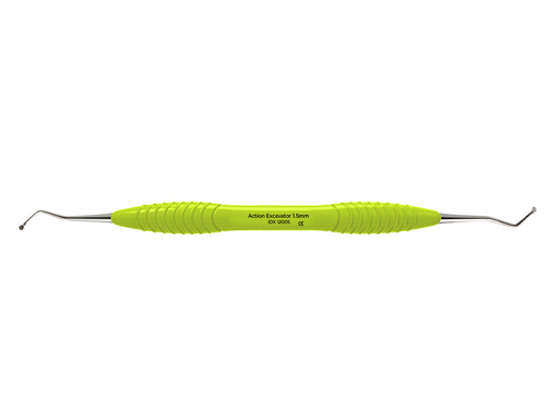 Exkavator med runda arbetsdelar och skäregg, 1,5 mm. För att avlägsna kariöst dentin, för depurering av konkava ytor samt för avlägsnande av granulationsvävnad i samband med apikal resektion, flapoperation och extraktion. Ergonomiskt ljusgrönt (lime) silikonhandtag, Ø 12 mm.
