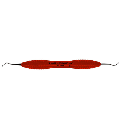 Dubbeländad exkavator med rund arbetsdel för att avlägsna debris och karies i kaviteter samt att avlägsna mjukt karierat dentin och provisoriska fyllningar. Ergonomiskt rött silikonhandtag, Ø 12 mm. Storlek: 1,5 mm