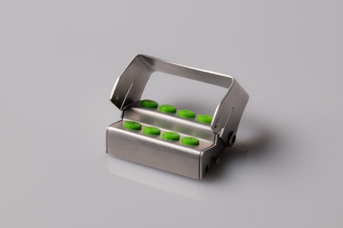 Organisera dina favoritborr och polerare i ett set. Vinklad borrhållare för bättre synlighet. Kvalitet i matt rostfritt stål. En smidig liten borrhållare med silikonproppar som gör att både turbin- och vinkelstycksborr passar i längder upp till 28mm. Mått: 47x30x25mm.