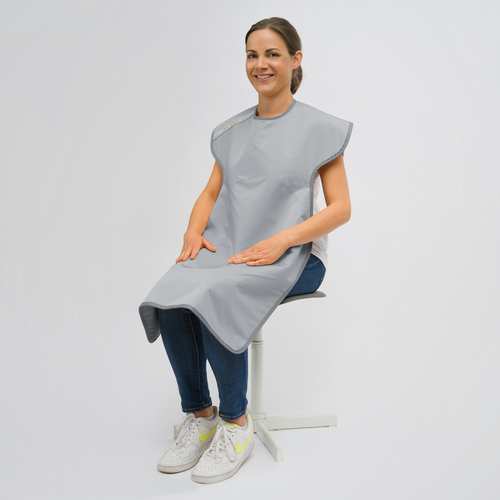 Röntgenskyddsförkläde utan krage för sittande patient. Bakknäppt förkläde av flexibelt blygummi med yta i Comfor-tex, blyekvivalens Pb 0,5 mm. Färg: Titan (grå).