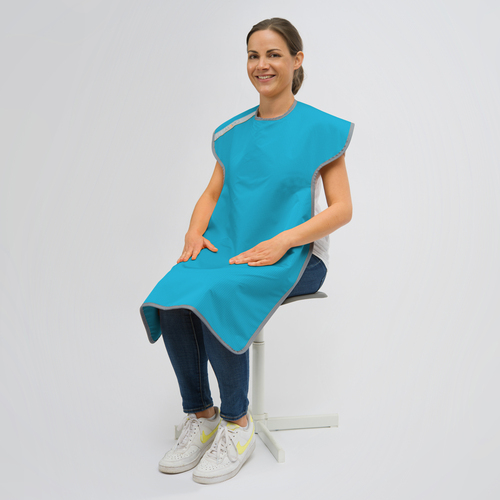 Röntgenskyddsförkläde utan krage för sittande patient. Bakknäppt förkläde av flexibelt blygummi med yta i Comfor-tex, blyekvivalens Pb 0,5 mm. Färg: Curacao (turkos).