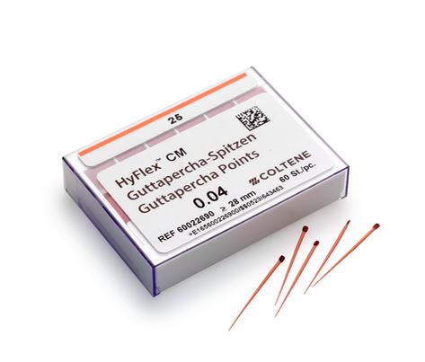 Guttaperkaspetsar perfekt anpassade till Hyflex CM NiTi filar, för att underlätta en optimal behandlingsprocess. Spetsarna motsvarar respektive filstorlekar och har den perfekta avsmalningen för att snabbt och enkelt obturera rotkanalen. Spetsens storlek kan lätt identifieras genom färgkodningen i toppen. Längd: 28 mm. 60st/förp.