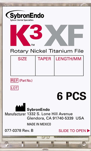 Taper .04, storlek 35, längd 30 mm, tillverkad i NiTi. K3XF är en vidareutveckling av K3-filarna och har genomgått Kerrs värmebehandlingsteknik som ger en mycket mer flexibel fil.