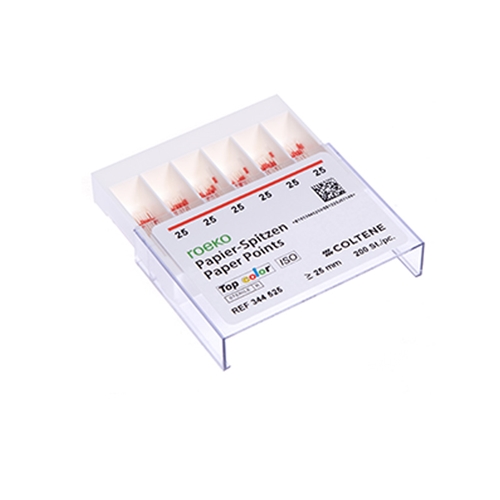 Sterilförpackade papperspetsar med färgkodning för enklare hantering. Längd 25-28 mm.