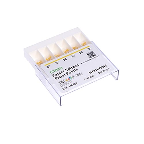 Sterilförpackade papperspetsar med färgkodning för enklare hantering. Längd 25 mm.