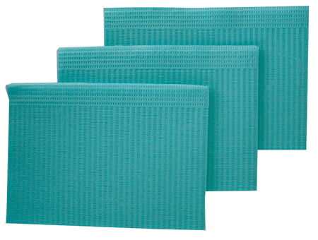 Dentalservetter med 2-lagers papper + 1-lagers PE, patenterad design för Dry-Back. Stl 33x45,5cm. Färg: turkos. 500st/förp.