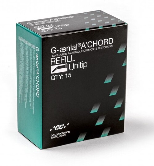 Estetisk ljushärdande universalkomposit med ett förenklat färgsystem i en egen utvecklad filler- och silan teknologi, mjuk och formbar. Består av 5 st grundfärger som uppnår estetiken i 16 klassiska VITA-färger, som täcker hela 90 % av restaurationerna. Genom att använda olika brytningsindex integreras G-aenial A'chord naturligt i tandstrukturen. Har en naturlig fluorescence. Radiopak.