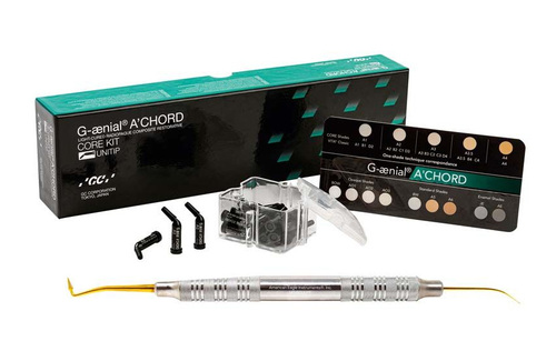 G-ænial A’CHORD täcker 90% av alla direkta restaureringar med 5 CORE-nyanser: A1, A2, A3, A3.5, A4. Kan enkelt modelleras med borste i det främre området, packningsbart i den bakre regionen, icke-klibbig konsistens. Ger naturlig fluorescens skapad av dess unika filler-teknologi som efterliknar reflektionen av naturligt ljus vilket resulterar i osynliga restaureringar både i naturligt dagsljus och under speciella ljusförhållanden