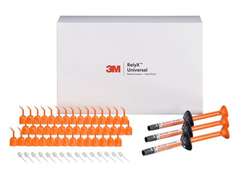 Varje storpack innehåller: 3 sprutor med 3M™ RelyX ™ Universal resincement (3,4 g per spruta), 45 3M™ RelyX ™ universella mikroblandningsspetsar, 15 förlängningsspetsar Färg: Translucent