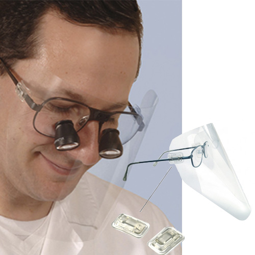 Clipon, plastclips som enkelt fästs på glasögonskalmarna för att sedan fästa plastvisir i. Justeras lätt till önskat höjd/bredd av visiret. Levereras med Large-visir som även täcker loupes.