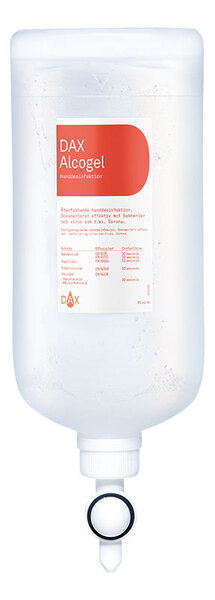 DAX Alcogel är avsedd för desinfektion av händer och och är effektiv mot bakterier och många typer av virus som t.ex. förkylningsvirus och influensavirus. Produkten är etanolbaserad och har en alkoholhalt på 85 vol%. Innehåller glycerin som återfuktar huden.