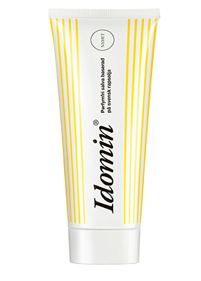 Idomin är en vit salva med tjock konsistens som återfuktar och reparerar skadad, torr eller irriterad hud. Produkten innehåller inget vatten vilket gör att huden inte torkar ut i kallt väder. Den skapar en vattenavvisande hinna vilket gör att fukten i stället kapslas in. Rapsolja och vaselin fungerar vårdande och mjukgörande, vitamin E stoppar fria radikaler och zinkoxid hjälper till att skydda huden. Den kan användas för en mängd områden, till exempel för spruckna läppar, torra armbågar eller röda babystjärtar. Den är dock inte bara hjälpsam för människor utan kan också användas på torra djurtassar. Idomin är fri från parfym och innehåller inga färgämnen eller konserveringsmedel.