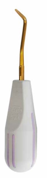 Luxator periotom av rostfritt stål med titanbeläggning som är speciellt designat med ett fint avsmalnande blad som komprimerar det alveolära benet, skär membranet och varsamt lossar tanden med minimal skada på vävnaden. Titanbeläggningen minskar friktionen och glider lätt. Behåller skärpan och behöver ej slipas. Ergonomiskt vitt handtag med färgkod lila med vinklad arbetsdel, bredd 3 mm. Levereras med skyddsbehållare Fixus.