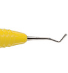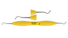 Dubbeländat kompositinstrument (burnisher) med droppformade arbetsändar för att forma och jämna ut ojämna marginaler och kanter vid restauration av tandfyllnadsmaterial. Ergonomiskt gult silikonhandtag, Ø 13,5 mm.