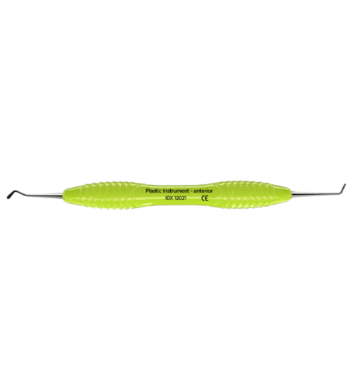 Dubbeländat kompositinstrument av rostfritt stål för konturering, placering och modellering av komposit anteriort. Ergonomiskt ljusgrönt (lime) silikonhandtag, Ø 13,5 mm.