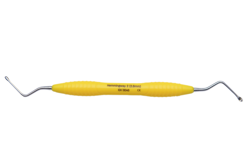 Dubbeländad oval ben curette som enkelt gör att man kan byta arbetssida. Arbetsdel 2,8 mm. För att ta bort debridering och cystor i öppning. Ergonomiskt gult silikonhandtag, Ø 12 mm.