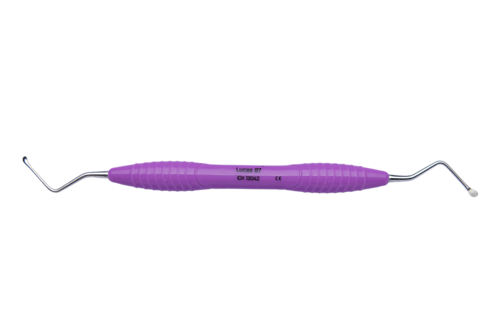 Dubbeländad skedformad ben curette som enkelt gör att man kan byta arbetssida. Arbetsdel 3,0 mm. För att skrapa och avlägsna överbliven mjukvävnad. Ergonomiskt lila silikonhandtag, Ø 12 mm.