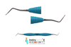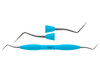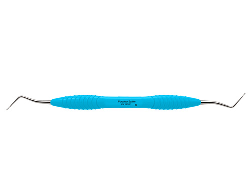 Dubbeländad böjd scaler för att rengöra furkationsytor och inre ytor, konkava ytor och skåror. Även lämplig för rengöring av skåror och approximala konkaviteter i premolarer och incisiver. Ergonomiskt blått silikonhandtag, Ø 12 mm.