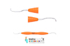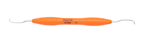 Dubbeländad finisheringscurette av rostfritt stål för avlägsnande av djup subgingival tandsten och finishering av subgingivala rotytor på mesialytor hos molarer. Ergonomiskt oranget silikonhandtag, Ø 12 mm.