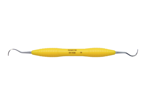 Dubbeländad universalcurette av rostfritt stål för att avlägsna måttlig till kraftig tandsten från supragingival och subgingivala tandytor. Används främst för stora molarytor. Ergonomiskt gult silikonhandtag, Ø 12 mm.