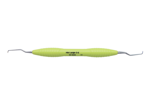 Dubbeländad universalcurett för avlägsnande av tandsten supragingivalt och subgingivalt. För furkationer, djupa fickor och i trånga approximalrum. Mini Langer har en kortare arbetsdel än standard Langer. För incisiver i överkäken och underkäken. Ergonomiskt ljusgrönt (lime) silikonhandtag, Ø 12 mm.