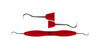 Dubbeländad sickel/scaler av rostfritt stål för att avlägsna supragingival tandsten approximalt i hela bettet. Har en tunn arbetsdel lätt böjd i sidled. Ergonomiskt rött silikonhandtag, Ø 13,5 mm.