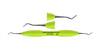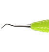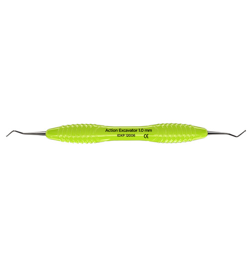 Exkavator med runda arbetsdelar och skäregg, 1,0 mm. För att avlägsna kariöst dentin, för depurering av konkava ytor samt för avlägsnande av granulationsvävnad i samband med apikal resektion, flapoperation och extraktion. Ergonomiskt ljusgrönt (lime) silikonhandtag, Ø 13,5 mm.