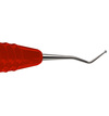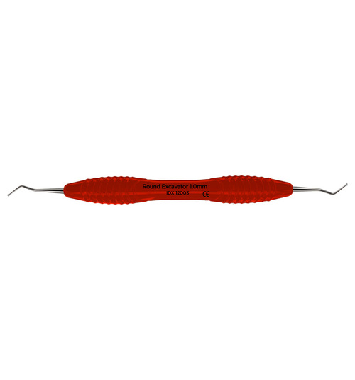 Dubbeländad exkavator med rund arbetsdel för att avlägsna debris, mjukt karierat dentin, provisoriska fyllningar m.m. Inom kirurgin avlägsna granulationsvävnad efter extraktion och skära av parodontala ligament före extraktion. Ergonomiskt rött silikonhandtag, Ø 13,5 mm. Storlek: 1,0 mm