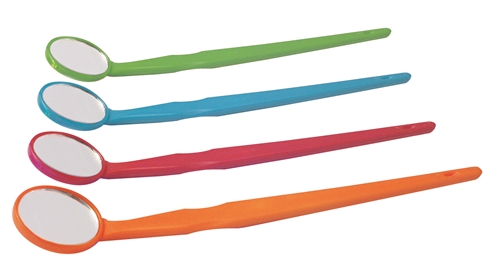 Munspegel i plast för att patienten själv ska kunna kontrollera tänder och tandkött.