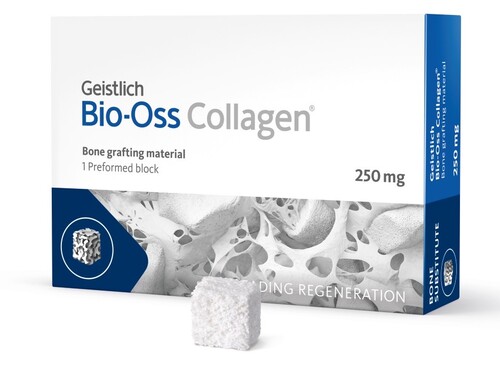 Tillägget av kollagen till Geistlich Bio-Oss®granulat gör Geistlich Bio-Oss®Collagen formbart och enkelt att hantera. Geistlich Bio-Oss® Collagen består till 90 % av Geistlich Bio-Oss® granulat och 10 % kollagen. Geistlich Bio-Oss® granulaten ger Geistlich Bio-Oss® Collagen alla fördelarna hos det vetenskapligt visade främsta biomaterialet inom regenerativ tandvård. Geistlich Bio-Oss® Collagen används i många olika situationer, såsom kristabevarande, mindre benersättningar och parodontal regeneration. Kollagenet absorberas inom några veckor och ersätter inte ett membrans barriärfunktion.