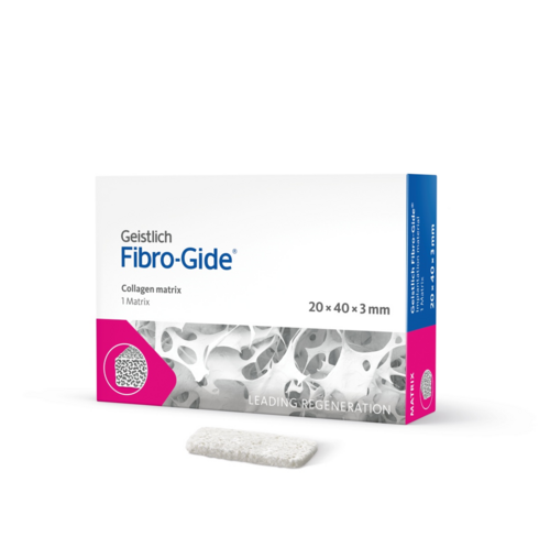 Geistlich Fibro-Gide är ett poröst, resorberbart och volymstabilt kollagenmatrix, speciellt utformat för mjukvävnadsregeneration. Fibro-Gides porösa nätverk stödjer kärlinväxt och bildandet av ny bindväv. Kollagenmatrixet är tillverkat av rekonstituerat kollagen, som genom korsbindning har god volymstabilitet, med bibehållen biokompatibilitet. Geistlich Fibro-Gide appliceras under en lambå och ska inte avlägsnas då det resorberas. Geistlich Fibro-Gide är alternativet till transplantation av patientens egen bindväv. Med Geistlich Fibro-Gide undviks ett tagningsställe och ingreppet för patienten minskar.