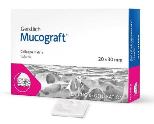 Geistlich Mucograft® är ett kollagenmatrix som är designat specifikt för oral mjukvävnadsregeneration. Dess indikation är att öka den keratiniserade vävnaden och att täcka blottade tandhalsar. Geistlich Mucograft® är ett alternativ till autologt mjukvävnadstransplantat.