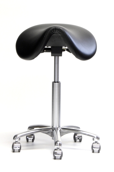 Sadelstol läder std färger. En mjuk och lite bredare sits. Handkontrollerad höjd och vinkeljustering under sitsen. Passar utmärkt till kvinnor. Underredet är kromat med mjuka hjul för hårda golv som standard. Gaspelare anpassas till användarens längd för optimal arbetsställning. De flesta sadelstolar kan utrustas med fotaktivator och ryggstöd.