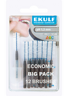 Borstarna består av 400-1000 små fina och tunna borststrån och har en rostfri, plastbelagd ståltråd som skyddar tänderna. Varje förpackning levereras med en skyddshylsa och greppförstorare.