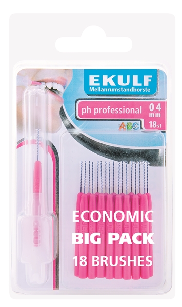 Ekulf pH professional mellanrumstandborste har 400-1000 små, fina och tunna borststrån och en rostfri, plastbelagd ståltråd som skyddar tänderna. Levereras med 18 st borstar i varje förpackning tillsammans med en skyddshylsa samt greppförstorare.