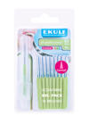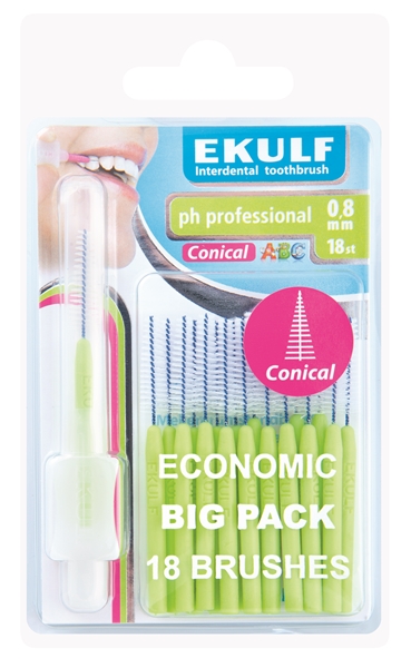 Ekulf pH professional mellanrumstandborste har 400-1000 små, fina och tunna borststrån och en rostfri, plastbelagd ståltråd som skyddar tänderna. Levereras med 18 st borstar i varje förpackning tillsammans med en skyddshylsa samt greppförstorare.