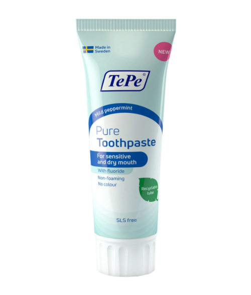 Extra mild tandkräm som är speciellt anpassad för personer med muntorrhet och känsliga munslemhinnor.