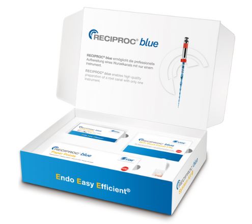 Reciproc Blue är ett enfilssystem med filar av nickeltitan för mekanisk rensning av rotkanalen. Finns i tre olika storlekar. Röd storlek 25 till smal kanal, svart storlek 40 till medium och gul storlek 50 till breda kanaler. Filspetsen är ej skärande. Korta 11 mm skaft för enklare åtkomst.